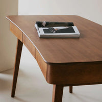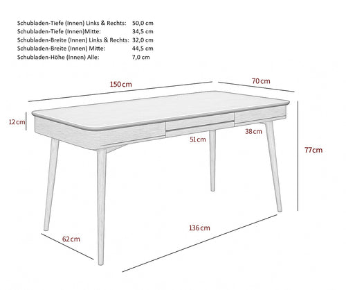 Drei praktische Schubladen sorgen für sinnvollem Stauraum, und dank des Push-to-Open-Systems lassen sie sich mühelos öffnen und schließen. Die Schreibtischplatte ist in zwei Varianten erhältlich: aus massivem Holz für eine warme, natürliche Optik oder aus weichem Echtleder, dass eine exklusive Haptik bietet und gleichzeitig geräuschdämpfend wirkt. Die Leder-Variante bietet zudem eine gelenkschonende Auflage, die den Komfort beim Arbeiten erhöht.