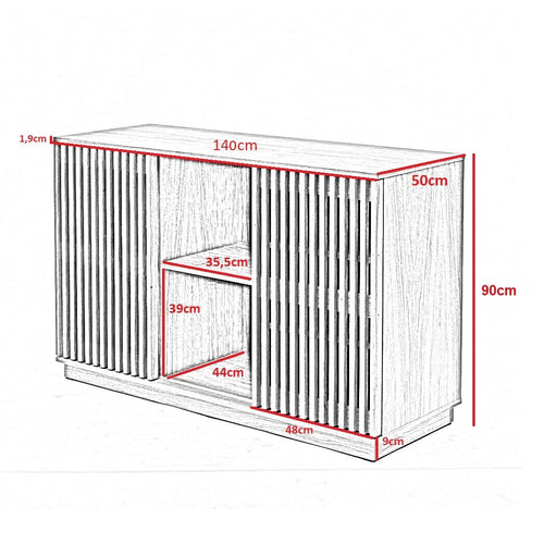 Die markanten Lamellenschiebetüren aus massivem Holz verleihen der Kommode ihren einzigartigen Charakter. Sie gleiten sanft auf den Aluminiumschienen und ermöglichen eine praktische und mühelose Handhabung.