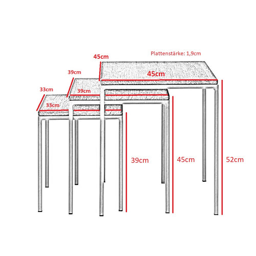 Unser elegantes Cube 3er Tisch-Set im Mid-Century-Design, besteht aus drei schönen Tischen. Alle 3 Tische haben verschiedene Größen und können somit praktischerweise einfach ineinandergeschoben werden können. Dadurch kannst du sie sehr flexibel und platzsparend je nach Bedarf einsetzen. Ob du sie zusammenstellst, um eine größere Ablage für gesellige Runden zu schaffen, oder sie einzeln in verschiedenen Bereichen plazierst bleibt natürlich dir überlassen. Gut aussehen und sinnvoll Platz schaffen werden sie in jeden Fall.